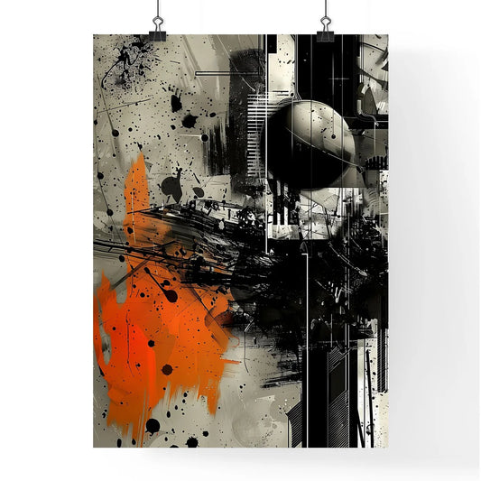 Abstract Geometric Painting: Black and Orange Collage Artwork with Text and Lines