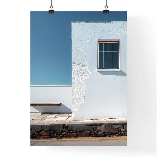 Contemplative Minimalist White Wall Frontage with Window, Blue Sky, and Bench, Realistic Tabletop Photography, Color-Blocked Shapes, Vibrant Painting, Art