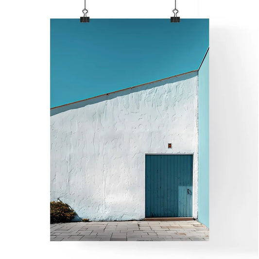 Serene Minimalist Tabletop Still Life: Color-Blocked White Wall Facade with Blue Door, Abstract Art Focus