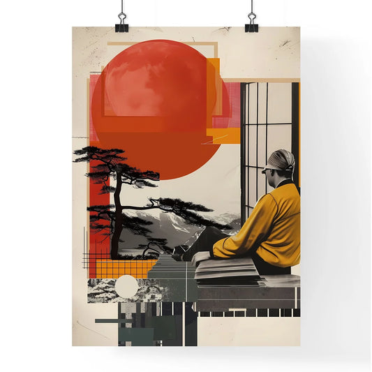 Art Deco Conceptual Collage: Japanese-Inspired Architecture, Window-Gazing Man, Vibrant Painting