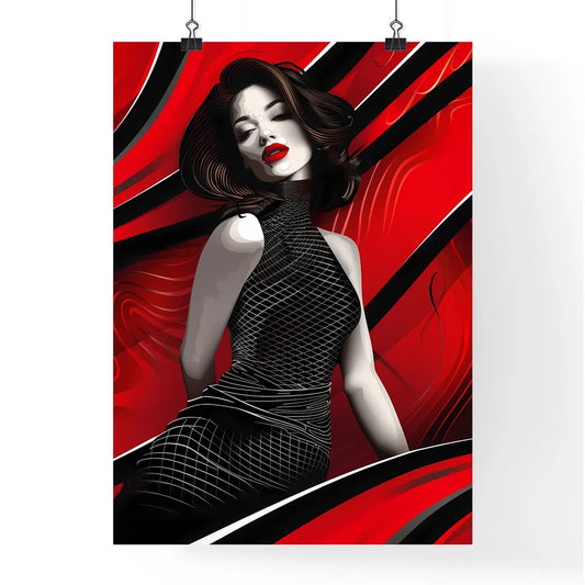 Fashion Illustration: Hyper-Detailed Woman in Striking Pose with Moire Effect Elements in Vibrant Black, White, and Red