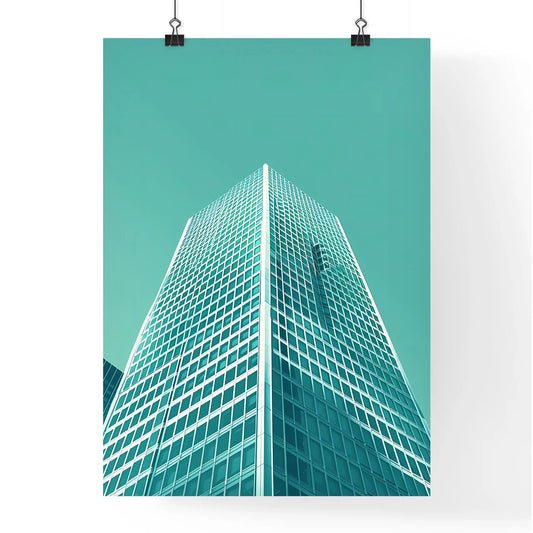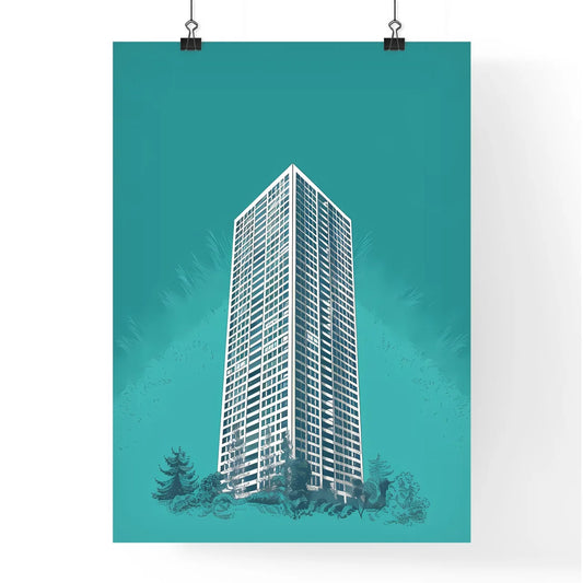 Vibrant painting with a focus on the art aspect, featuring a simple line art drawing of a high-rise building with many windows, white lines on aqua background, with room for text.