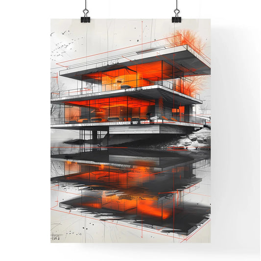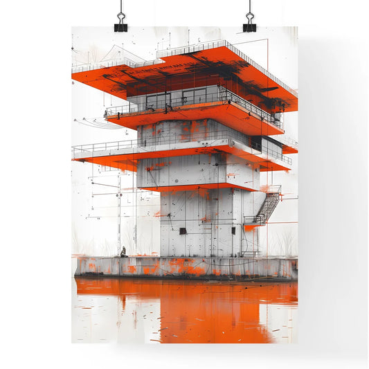 Striking Architectural Artwork: Vibrant Orange and Red Painting of a Modern Building on the Dock with Nautical Precision and Sketchfab Details