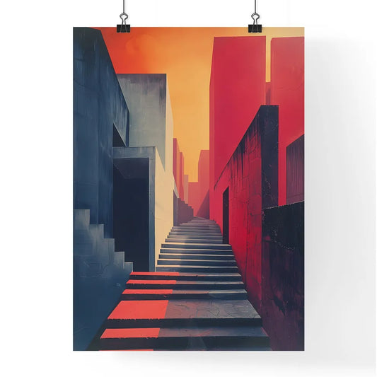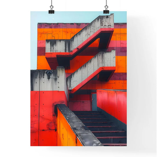 Abstract minimalist building art painting poster design with geometric shapes and vibrant colors, featuring a staircase and architectural elements