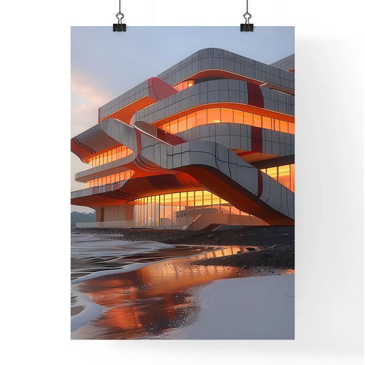 Futuristic Architectural Masterpiece: Abstract Painting Showcasing Geometric Facades and Water Reflections