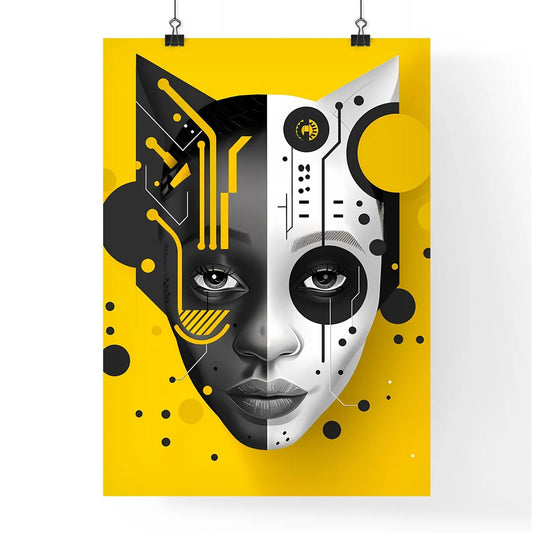 Artful Election Commentary: Woman with Cat Mask, Social Media, Hackers, Black & Yellow, Primitive Shapes, Vibrant Painting