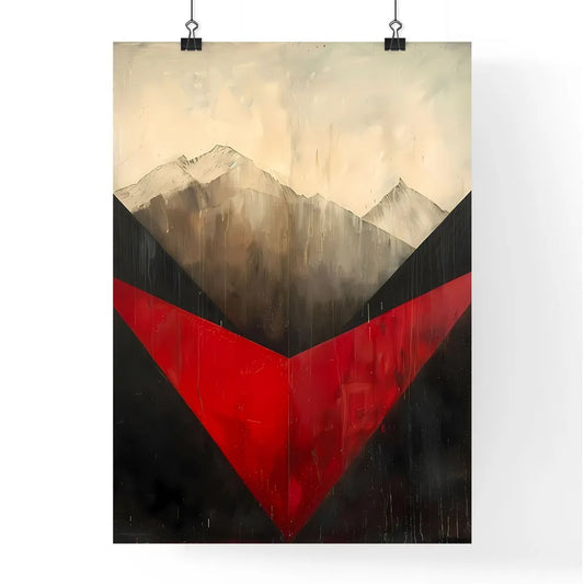 Modern abstract art painting, geometric shapes, black, white, and red colors, mountains, triangle