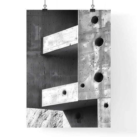 Vibrant Painting Displaying Abstract Brutalist Architecture with Concrete Walls and Intricate Hole Patterns
