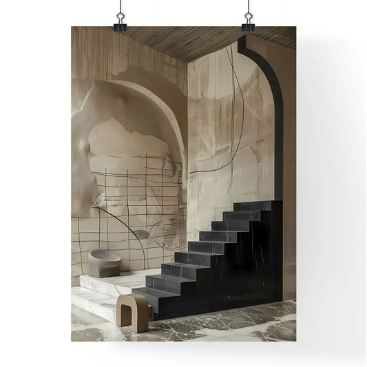 Textured Black and White Abstract Staircase Painting with Curvilinear Forms and Serene Simplicity
