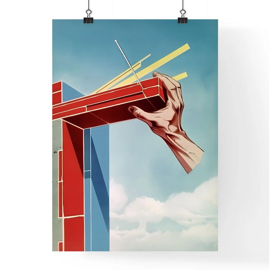 Vibrant Cubist Painting: Hand Unveiling Paper with Blown-Off-Roof Perspective, Labor Depictions, and Color-Blocked Shapes