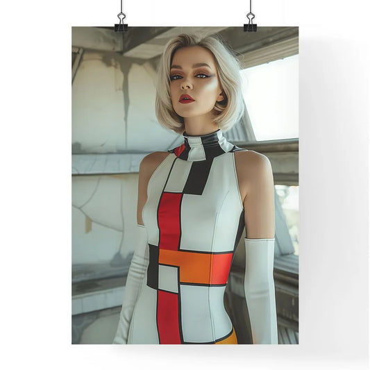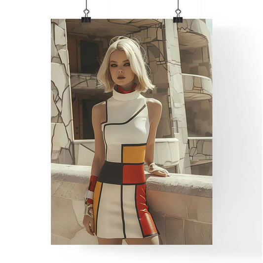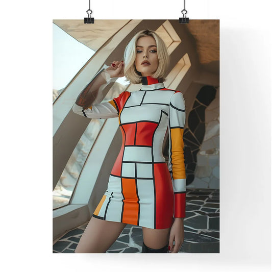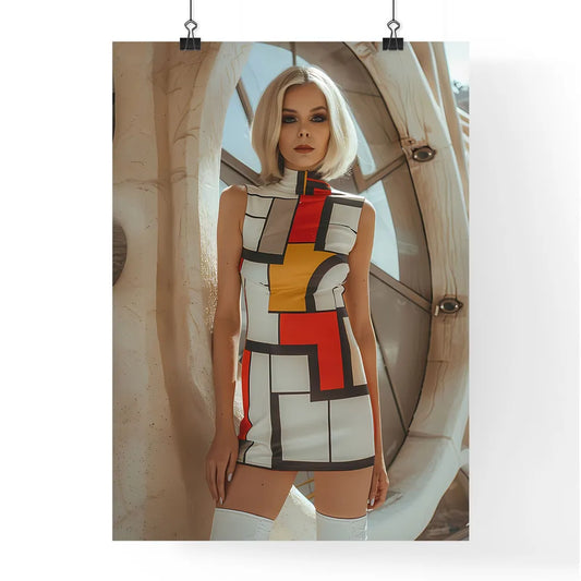 Vibrant Retro Futuristic Painting of a Blonde Woman in a 60s-Inspired Dress and Boots, Minimalist House Background, Art Focus