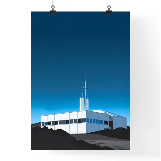 Vibrant Abstract Painting of a White Building with a Radio Tower and Cross on a Hill