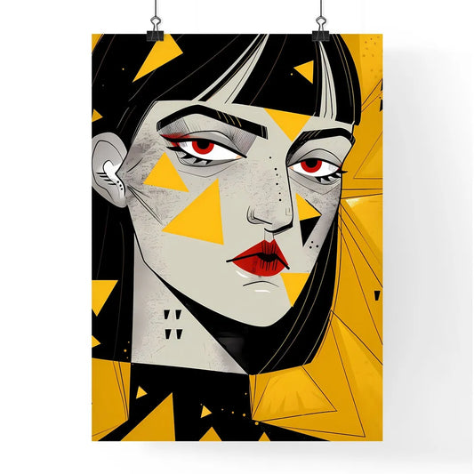 Boldly Grotesque Cartoon of Red-Eyed, Black-Haired Girl with Vibrant Yellow Triangles