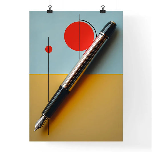 Minimalist Bauhaus Fountain Pen on Vibrant Blue and Yellow Background, Inspired by Japanese Book Covers, Modern Art Painting