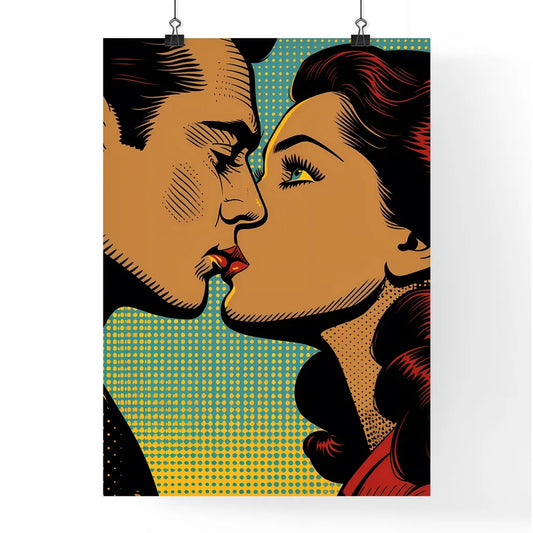 1970s Retro Comic Book Style: Vibrant Comic Strip of Girl Kissing Artistically Tattooed Man/Woman with Distinct Facial Features