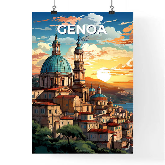 Genoa, Italy, A Poster of a city with a dome and a blue roof