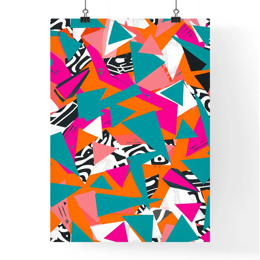 Geometric Abstract Painting with Vibrant Hot Pink, Orange, Cyan, White Triangles
