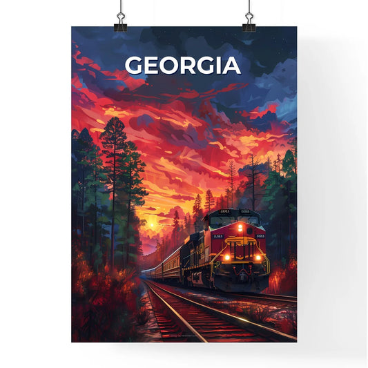 Georgia, USA - Painting of a Train on Tracks with Colorful Trees and a Sunset