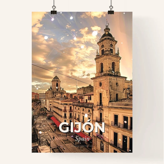 Gijon, Spain, A Poster of a street with buildings and a tower in the background