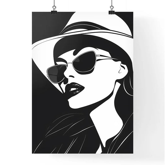 Retro aesthetic minimalist art print, black and white fashion poster, modern woman wearing sunglasses and hat
