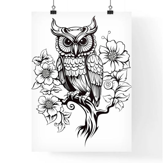 Black And White Drawing Of An Owl On A Branch With Flowers Art Print