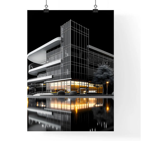 Black and White High School Architecture Design Icon, Building, Trees, Water, Vibrant Painting, Art