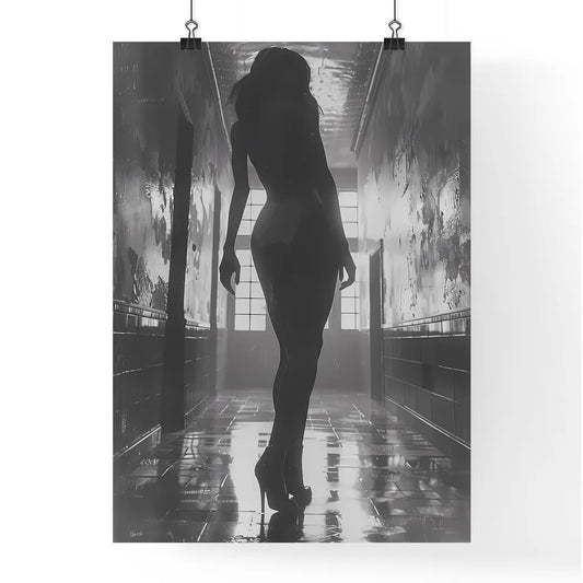 Film Noir Femme Fatale: Mysterious Black and White Painting of Shadowy Woman in Heels in Dim Lit Hallway