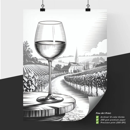Elegant Wine Glass Overlooking Scenic Vineyard Landscape in Artistic Black and White Illustration.