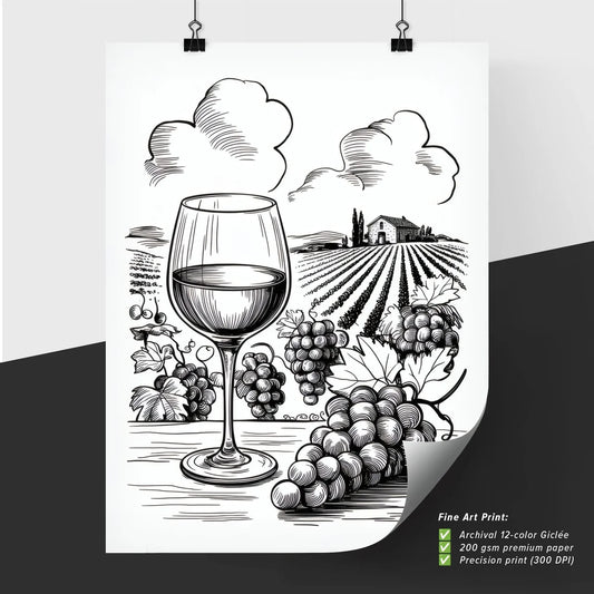 Elegant Wine Glass Surrounded by Grapes and Scenic Vineyard Landscape in Classic Black and White Illustration.