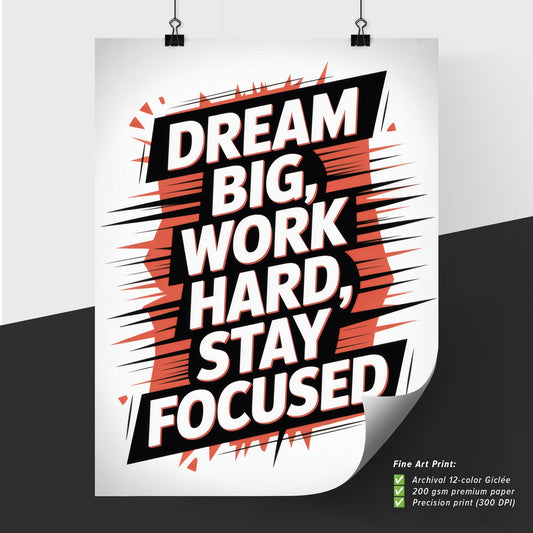 Motivational Quote: Dream Big, Work Hard, Stay Focused - Inspirational Typography Artwork for Personal Growth and Success.