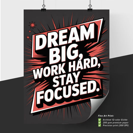 Motivational quote poster: Dream big, work hard, and stay focused for success and inspiration.