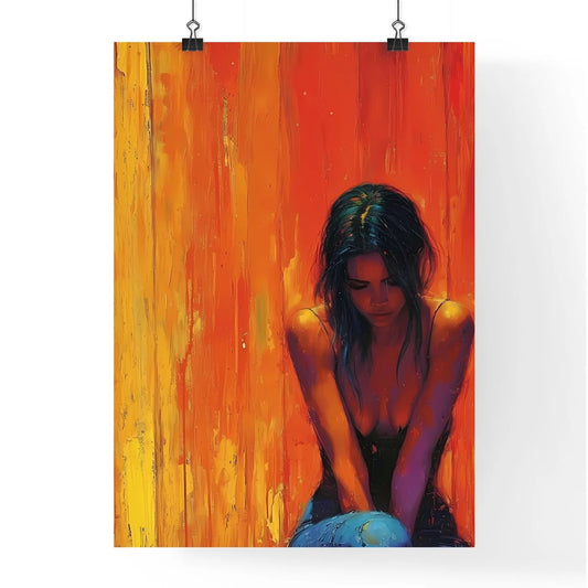 Minimalism, pin up art - Art print of a woman sitting down in front of a colorful wall