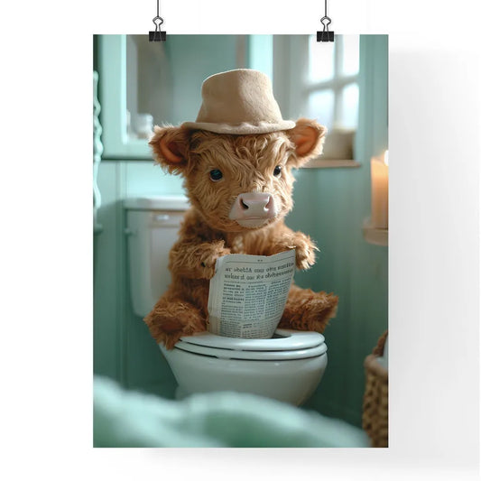 A cow sitting on a tiny toilet - Art print of a stuffed animal sitting on a toilet