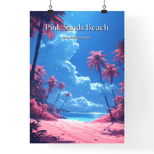 Pink Sands Beach - Art print of a beach with palm trees and a blue sky