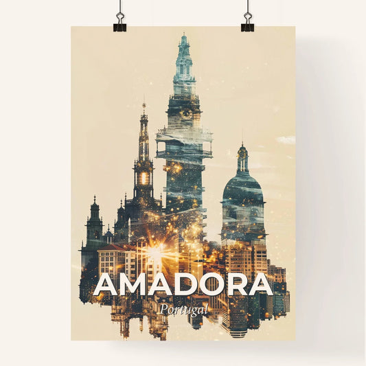 Amadora City Skyline Poster Art, Portugal Nightlights - A city skyline with a clock tower