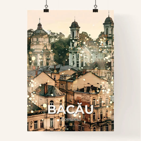 Bacau Skyline Double Exposure Art Poster - A group of buildings with lights