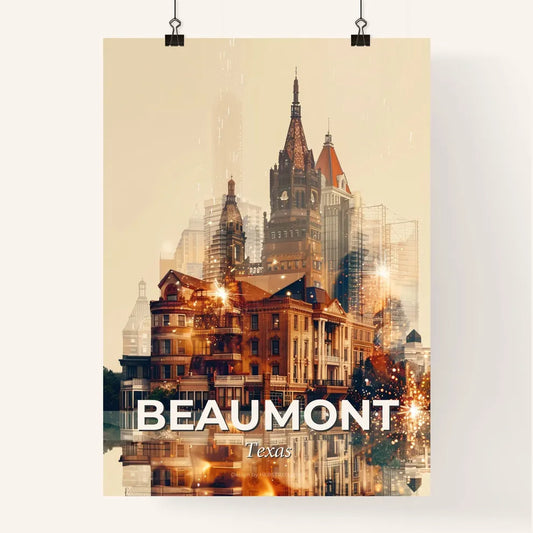Beaumont Skyline Composite Art - Bright Beige Paper Background - A building with a tower and a body of water