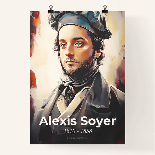 Portrait of Alexis Soyer, 1810 - 1858. Impressionistic painting of a painting of a man wearing a hat.