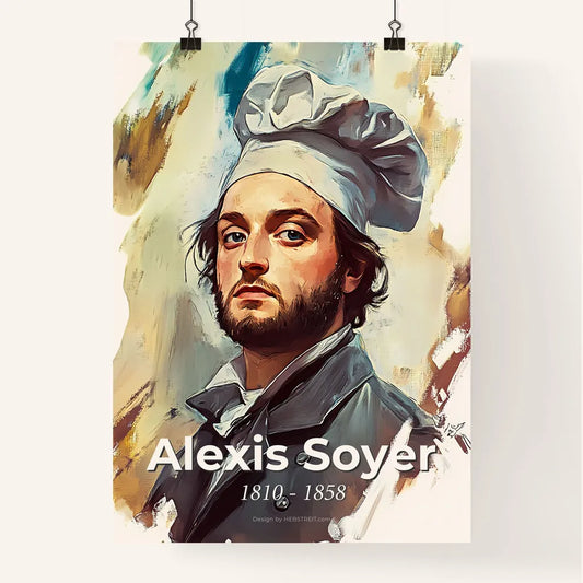 Portrait of Alexis Soyer, 1810 - 1858. Impressionistic painting of a man wearing a chef hat.
