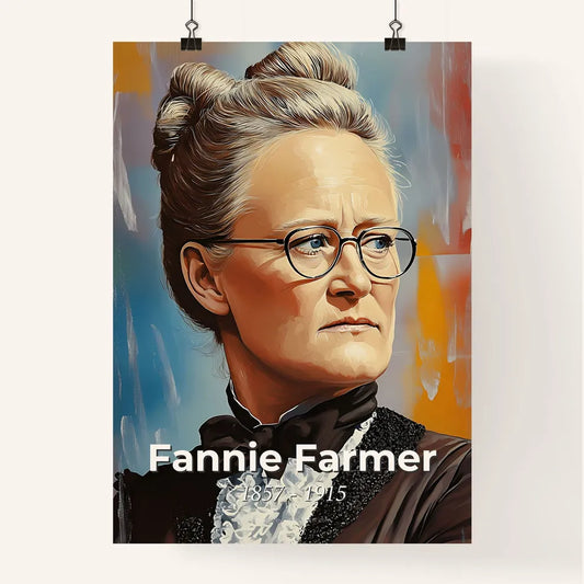 Portrait of Fannie Farmer, 1857 - 1915. Impressionistic painting of a woman with glasses and a bun.