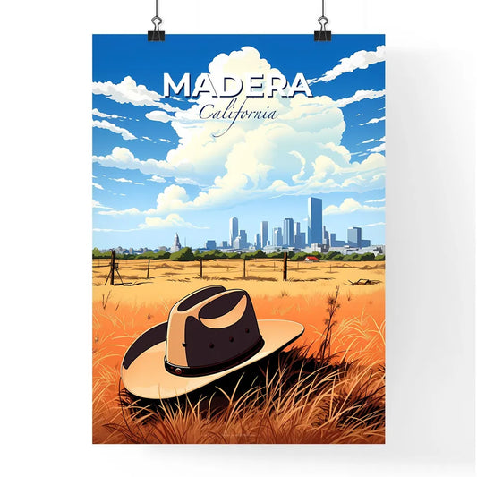 Madera, California, A Poster of a hat in a field with a city in the background