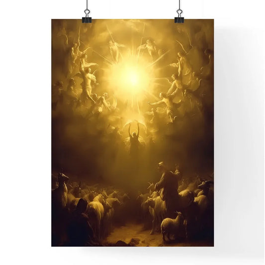 Moses prophet of God herding the flock in the desert, looking up at the sky - Art print of a painting of a group of angels and a group of goats