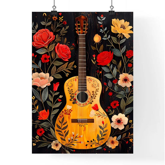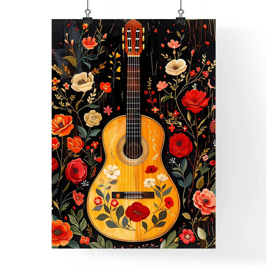 Guitar Collage Art: Vibrant Oaxacan Embroidery, Roses, Hearts & Midsummer Floral on Boho Dark Background