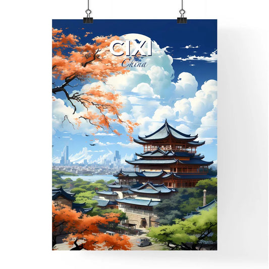 Vibrant Painting of Cixi China Skyline with Roof Architecture and Trees