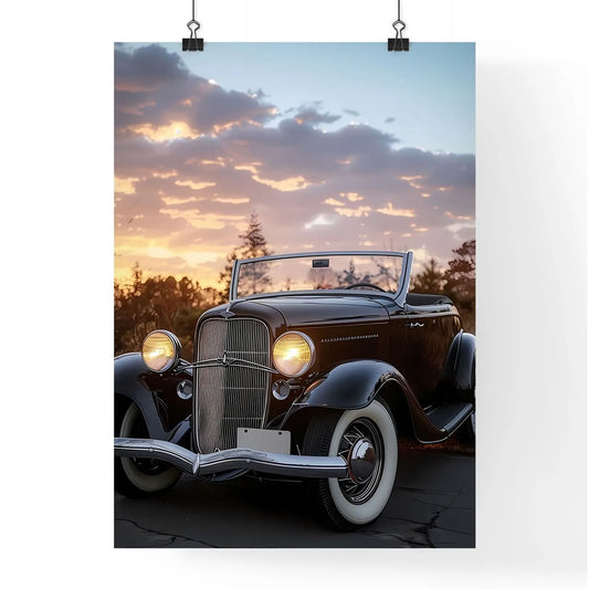 Black vintage car with large front bumper, gradient blue sky, 4K