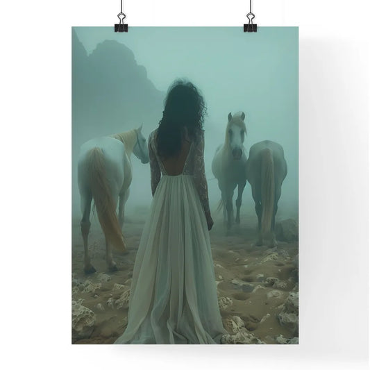 Artful Cinematic Portrait of a Young Equestrian Girl Amidst Steeds in a Misty Desert Landscape