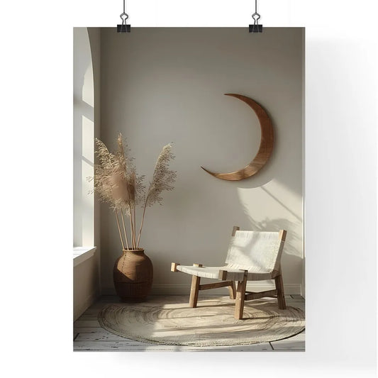 Boho Line Art Print with Moon, Chair, and Vase of Dry Flowers, Neutral Minimalist Home Decor Wall Art