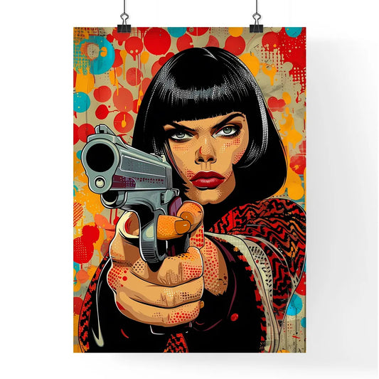 Hard Edge Pop Art Woman with Gun: Vibrant Painting Featuring Enlarged Print Screen Dots and Pop Art Color Schemes