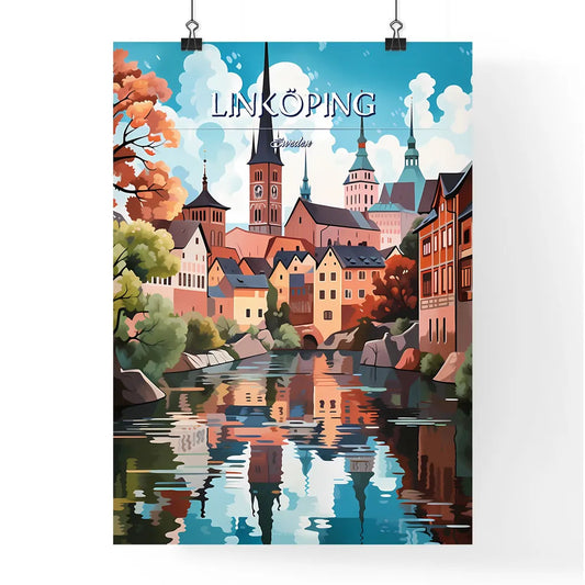 Linköping, Sweden, - Art print of a water body of water with buildings and trees