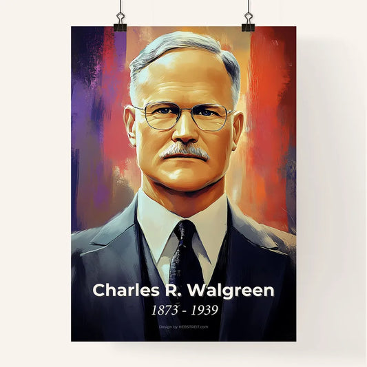 Portrait of Charles R. Walgreen, 1873 - 1939. Impressionistic painting of a man wearing glasses and a suit.